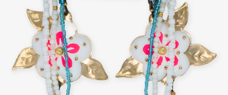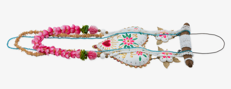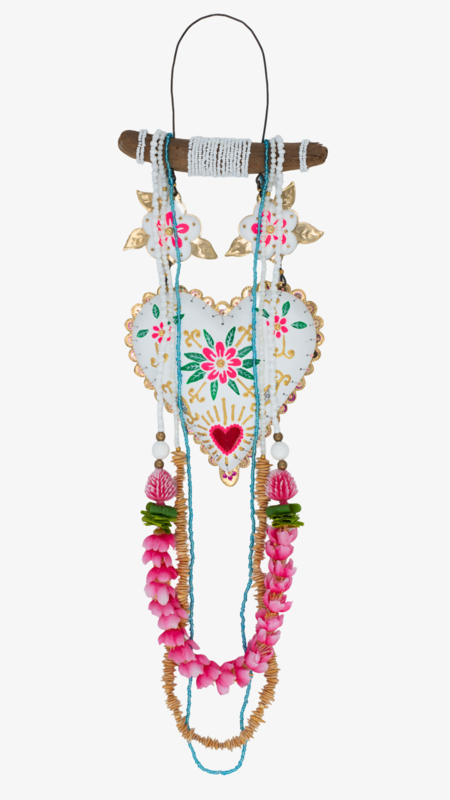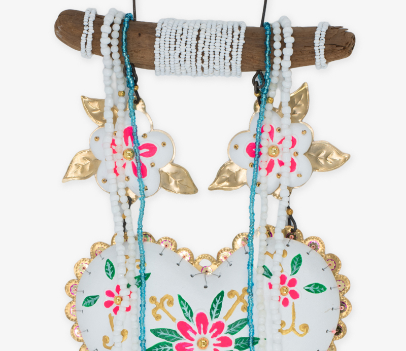 Materialen: Hout, klei, messingfolie, ijzerdraad, acrylverf, zijdebloemen, kralen, meloenpitjes, pailletten.