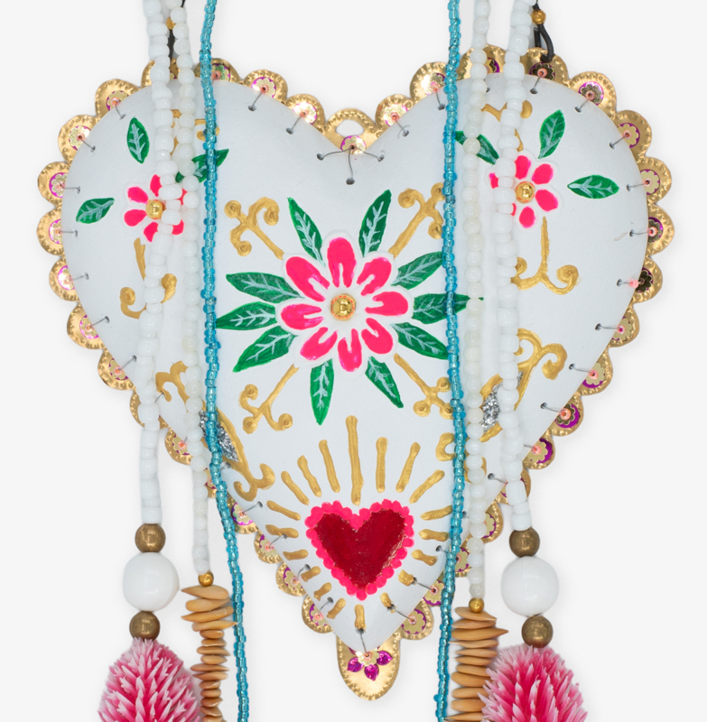 Gewoon, alleen maar liefde, deze kleurrijke, rijkelijk versierde versiering. Het hart is van zelfdrogende klei op messing achterkant net als de 2 bloemen boven het hart, beschilderd met acrylverf. Het messing zal in de loop van tijd donker verkleuren.