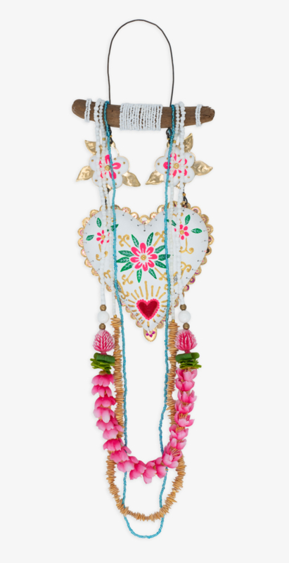 Gewoon heel blij, deze kleurrijke, rijkelijk versierde versiering. Het hart is van karton, beschilderd met acrylverf en kleine kraalborduursels en een schub rand van ijzerdraad. 1 Ketting is gehaakt, 1 is…€ 150,00